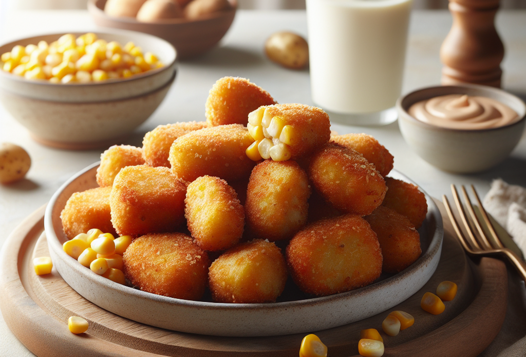 Esta receita de nuggets de milho e batata assados é uma opção saudável e saborosa para as crianças. Feitos com ingredientes nutritivos como milho, batata, aveia e temperos naturais, esses nuggets são uma excelente fonte de fibras, vitaminas e minerais essenciais para o crescimento e desenvolvimento das crianças. O tempo de preparo é de aproximadamente 40 minutos e rende cerca de 20 nuggets. Sirva com acompanhamentos como molho de iogurte com ervas e uma salada colorida para uma refeição completa e equilibrada.